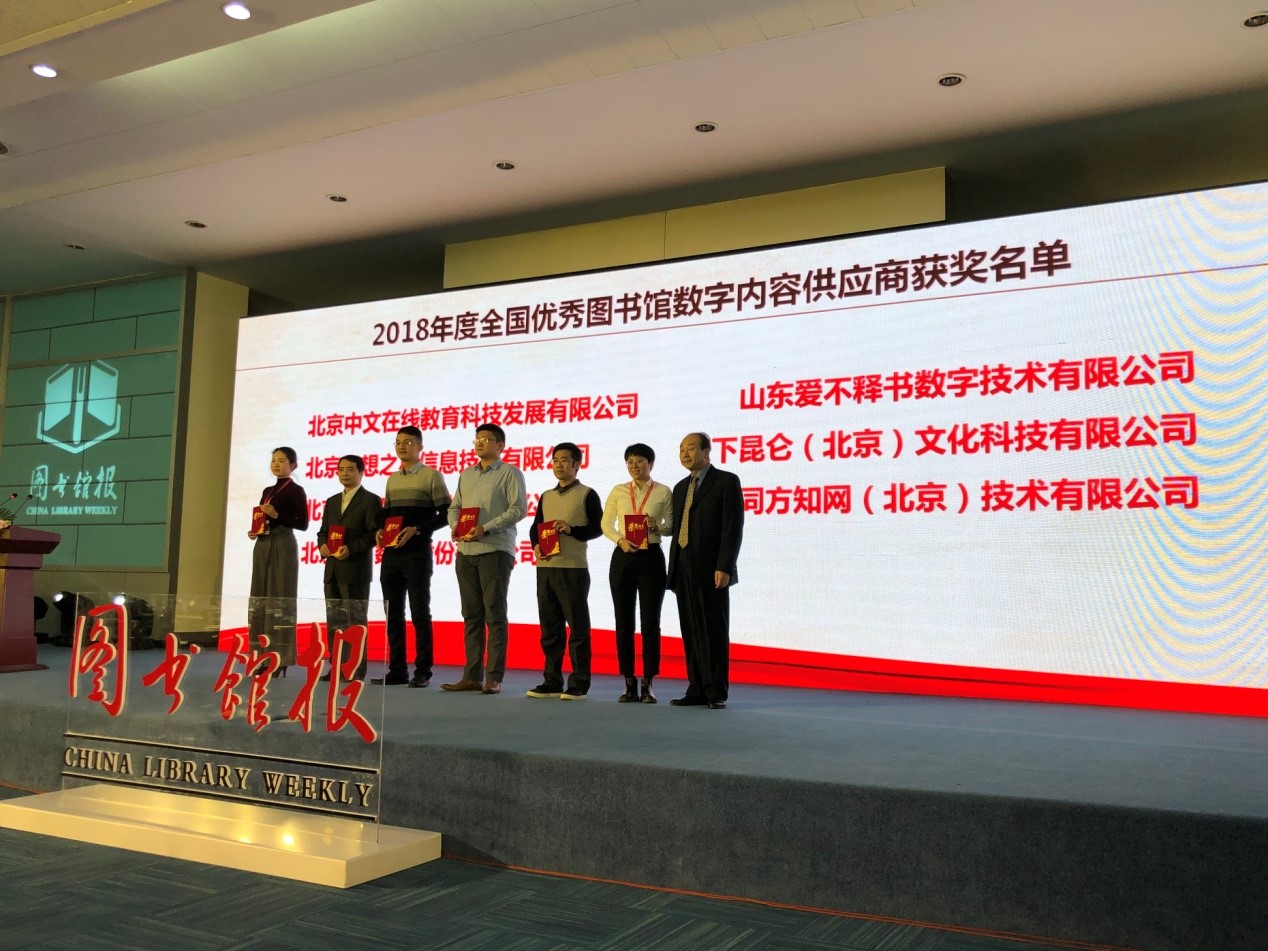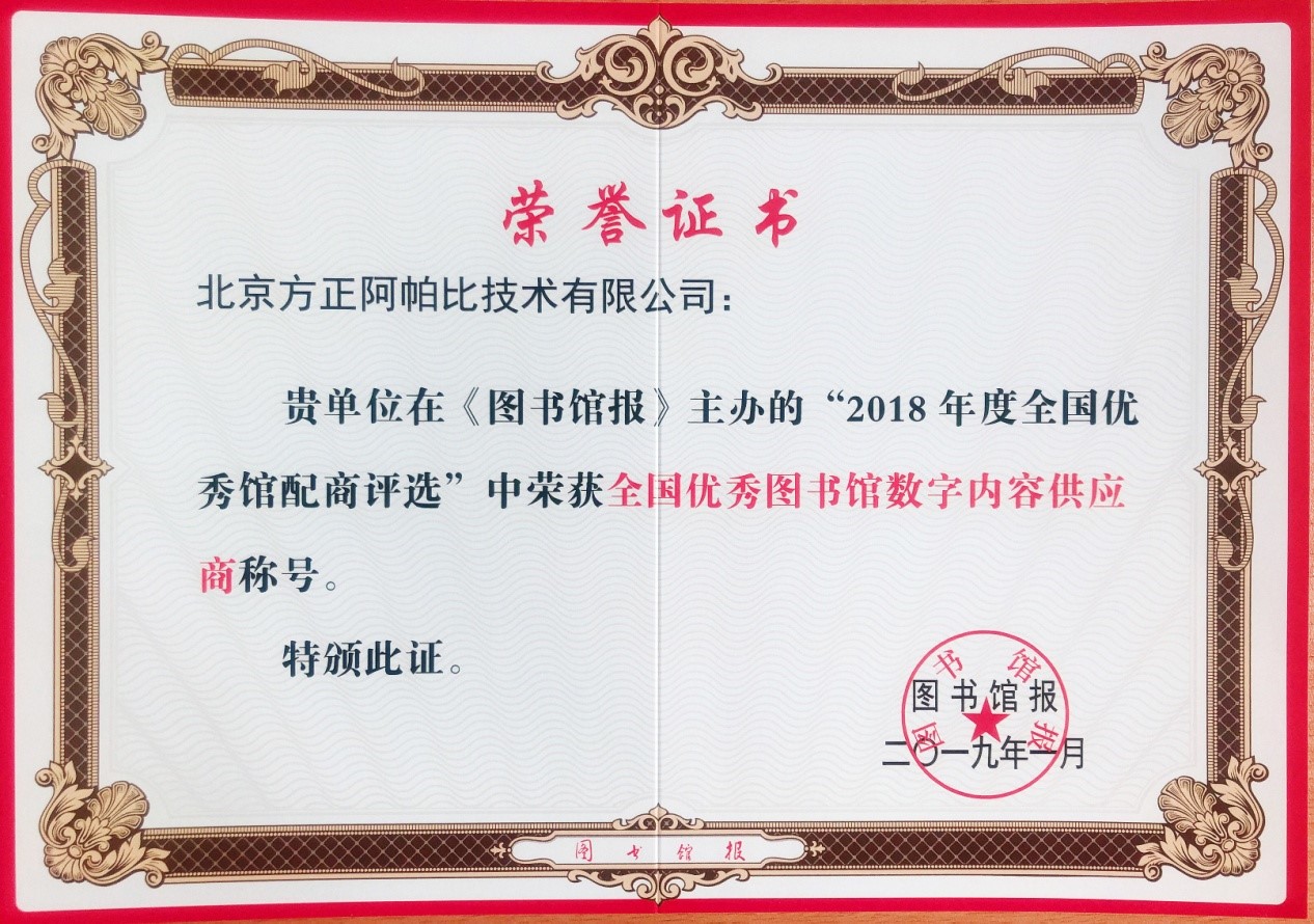 論壇期間進行了全國優秀館配商頒獎典禮,這是館配行業共建共享的權威評選活動,也是業內公認的評價館配企業的重要參考指標。在2018全國優秀館配商評選活動中,北京方正阿帕比技術有限公司脫穎而出,獲得“2018全國優秀圖書館數字內容供應商”殊榮。