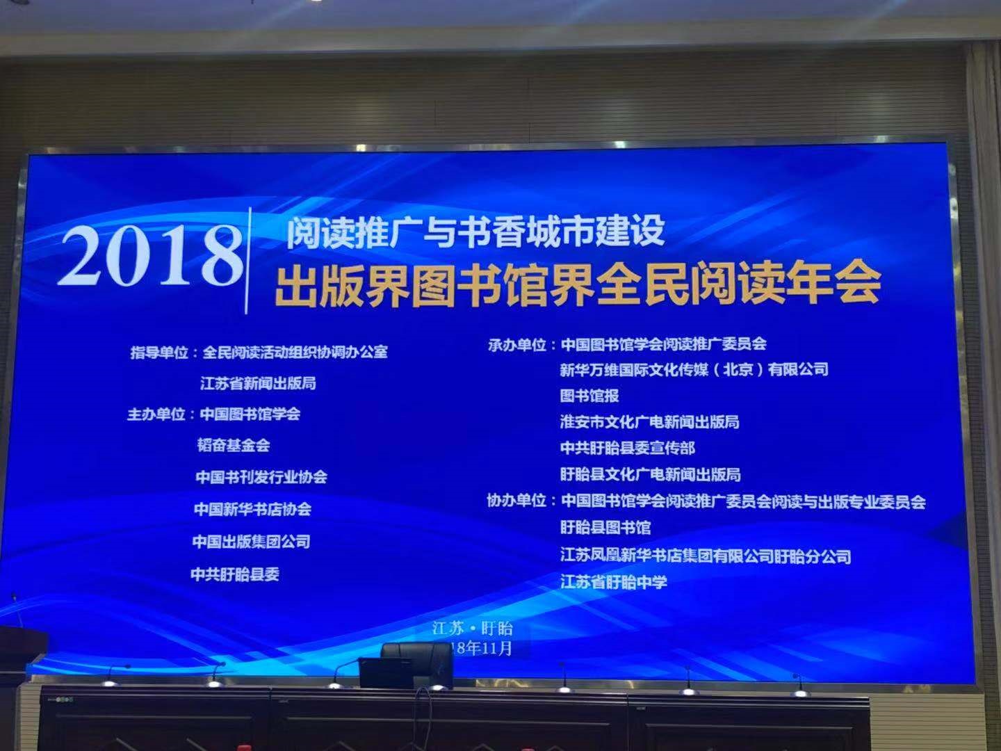 11月23日,由中國圖書館學會、韜奮基金會、中國書刊發行業協會、中國新華書店協會、中國出版集團公司主辦的“2018出版界圖書館界全民閱讀年會”在江蘇盱眙舉辦。本屆年會以“閱讀推廣與書香城市建設”為主題,邀請出版界、發行界、圖書館界200余位嘉賓出席,為推進全民閱讀建言獻策。