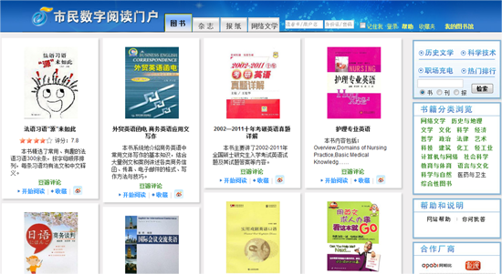 上海圖書館在上海圖書館建館60周年之際,上海圖書館推出“上海市民數字閱讀推廣計劃”,2012年主題是“館藏數字資源介紹及新技術體驗互動”。據介紹,該閱讀平臺為上海市民數字閱讀的統一入口,讀者證登錄一次即可使用網站的所有資源,不分卡的功能權限。資源上包括50萬冊方正電子書、400余種方正數字報、1000余種時尚期刊及多種多媒體館藏精品,并且資源會在首頁上動態滾動呈現。