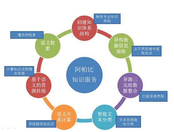 知識服務(wù)涉及多方面技術(shù),方正阿帕比形成了整體的知識服務(wù)解決方案。整體知識服務(wù)解決方案中包括知識體系結(jié)構(gòu)創(chuàng)建,異構(gòu)數(shù)據(jù)抽取,三元組數(shù)據(jù)整合,文本智能分類,語義關(guān)系計(jì)算,基于語義的資源數(shù)據(jù)掛接以及語義檢索等。