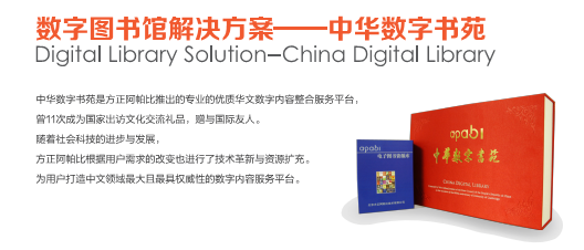 中華數字書苑是方正阿帕比推出的專業優質華文數字內容整合服務平臺,收錄了建國以來大部分的圖書全文資源、全國各級各類報紙及年鑒、工具書、圖片等特色資源產品,旨在為圖書館、學校、企業、政府等客戶及其所屬讀者提供在線閱讀、全文檢索、離線借閱、移動閱讀、下載、打印等數字內容和知識服務。